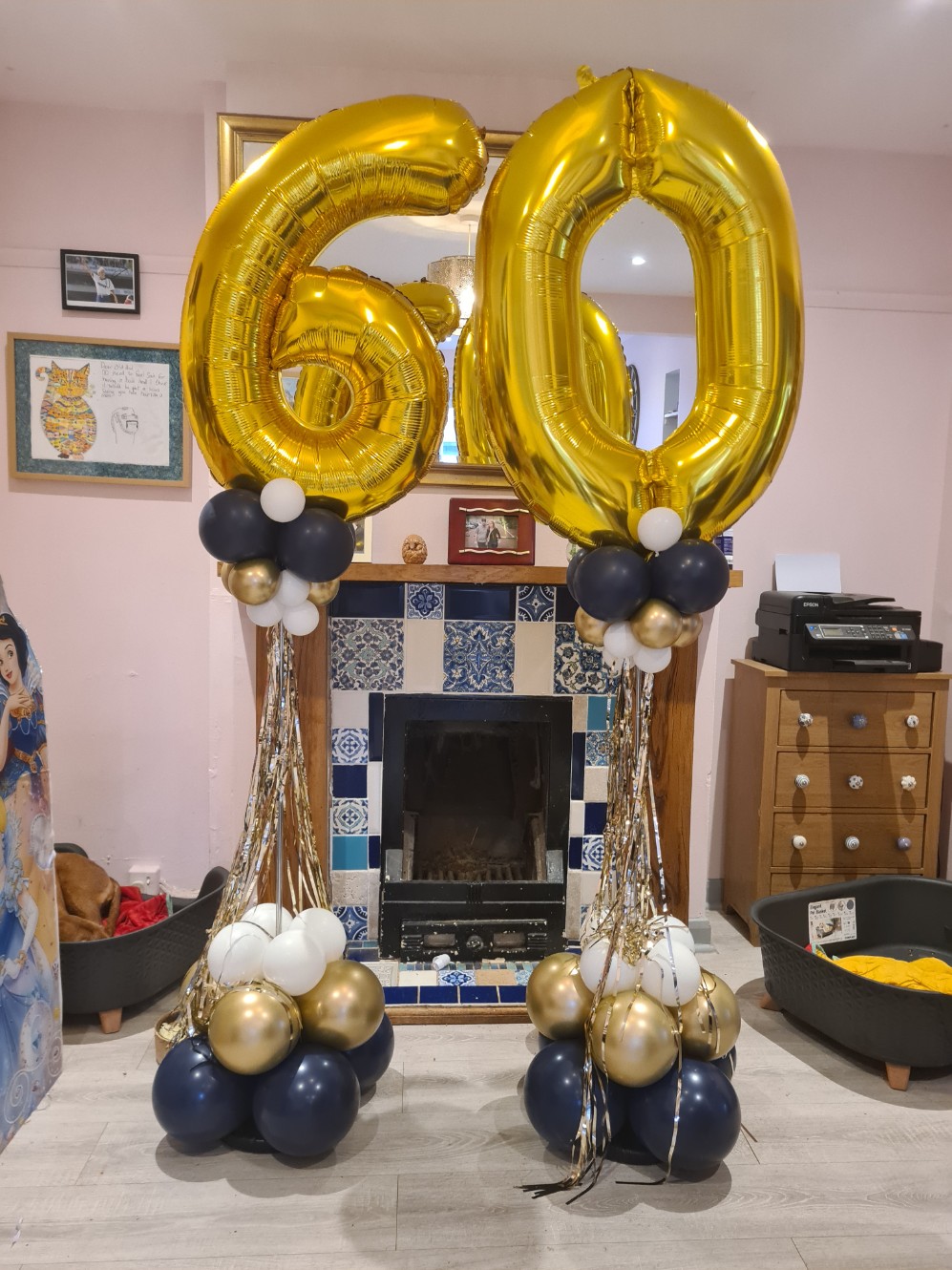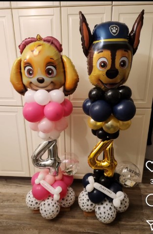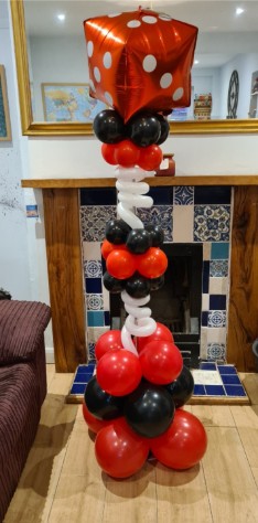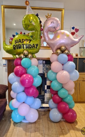 These pillars stand about 6 foot + tall and we have lots of colours to choose from. We can place any balloon for a top from( themed or number balloons) and we can put writing on the clear bubble or on the top balloon. Prices start from - £30 single pillar Price for a set is £55 Bespoke designs vairy in price depending on complexity. We can add logos, names, lights etc Lifespan - 5days +